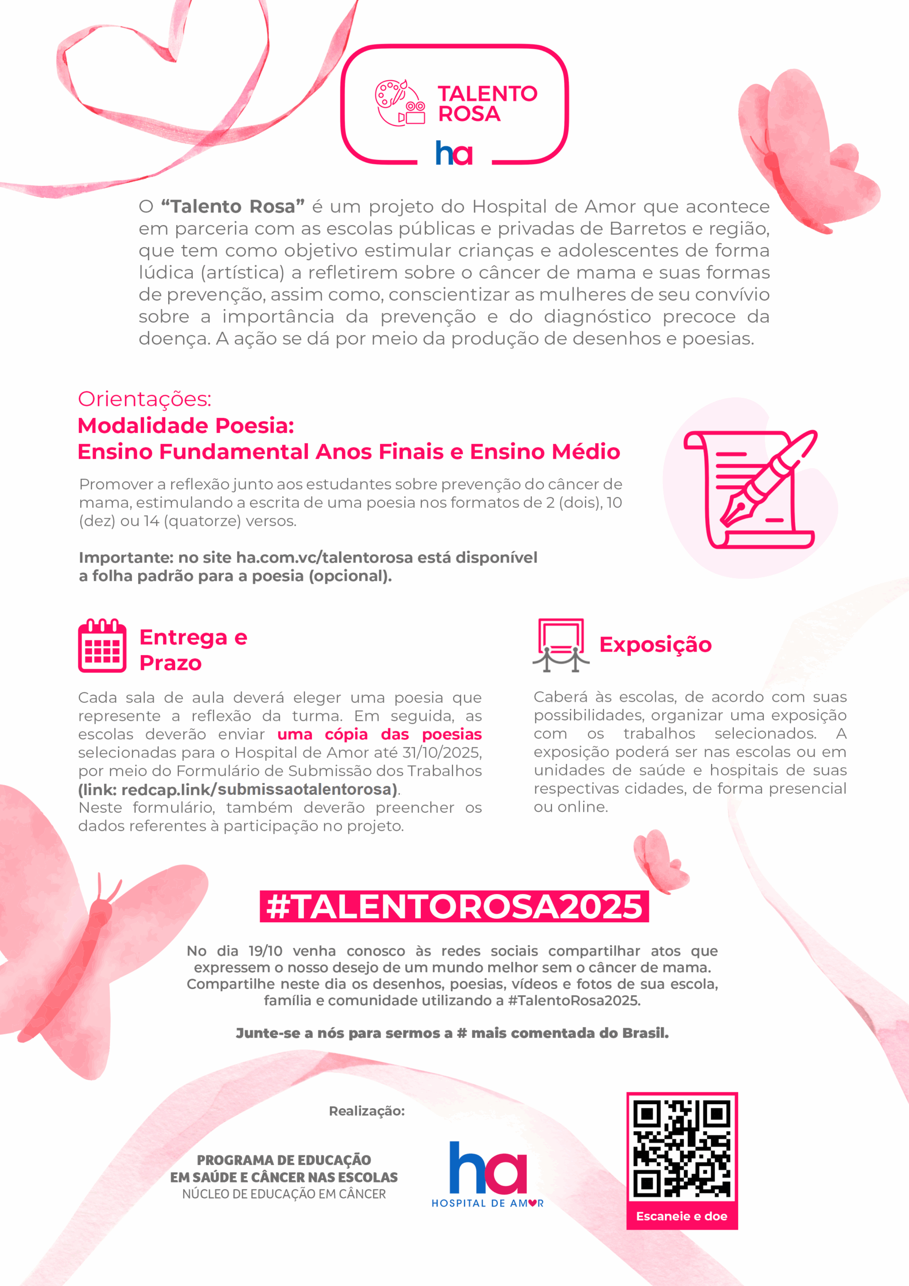 O “Talento Rosa” é um projeto do Hospital de Amor que acontece em parceria com as escolas públicas e privadas de Barretos e região, e tem o objetivo de estimular crianças e adolescentes de forma lúdica (artística) a refletirem sobre o câncer de mama e suas formas de prevenção, assim como, conscientizar as mulheres de seu convívio sobre a importância da prevenção e do diagnóstico precoce da doença. A ação se dá por meio da produção de desenhos e poesias.